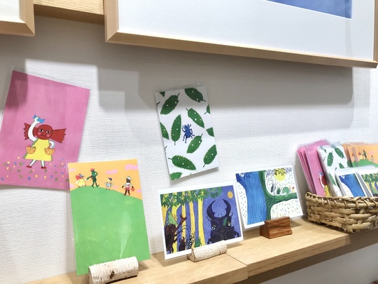 月曜日に店に到着した、たけがみたえさんの木版画は想像していた通りに美しくてとっても綺麗で。なんと、たけがみさん自らが店内に絵を掛けてくださいまして! ポストカードや子どもたちのプチイベント用にオリジナルのぬりえまでご用意してくださっています。