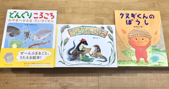 『ちょろりんととっけー』のお話しの舞台は夏なのですが、お探しのタイミングでぜひ出会っていただきたい1冊のためご提案。また、心やさしいくぬぎくんが活躍する『くぬぎくんのぼうし』は秋色の風景がとても素敵な1冊で、森の仲間としてちょっぴりシャイなトカゲくんも登場します。そして、お散歩の楽しい季節の秋の1冊には、最初から最後まで全部歌える『どんぐりころころおやまへかえるだいさくせん』を選びました。♪どんぐりころころのリズムのピタッとはまるこの絵本は、読み聞かせ会でも大人気の絵本です。