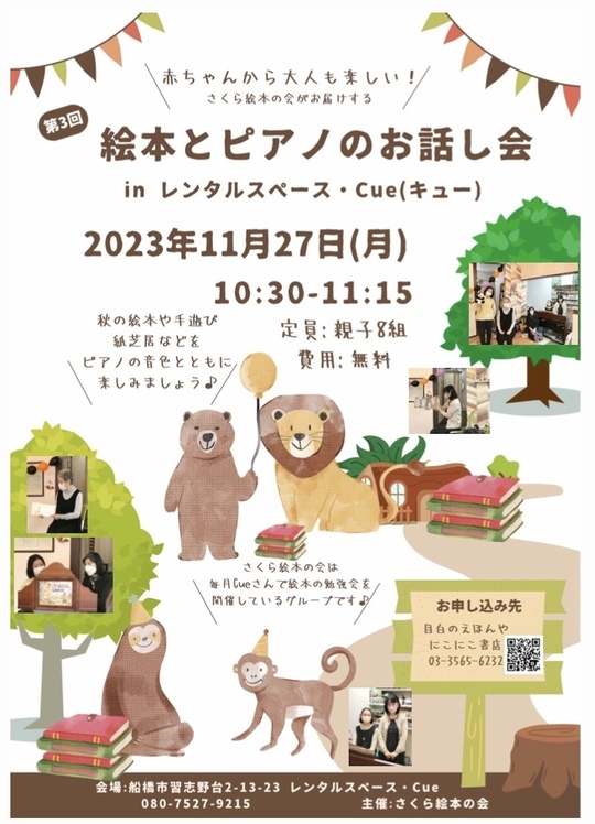 月に一度、船橋市のレンルスペース・Cue(キュー)さんで絵本の勉強会を開催している「さくら絵本の会」のメンバーが、赤ちゃんからママやパパ、大人の方まで一緒に楽しめる穏やかな絵本の時間をお届けします。