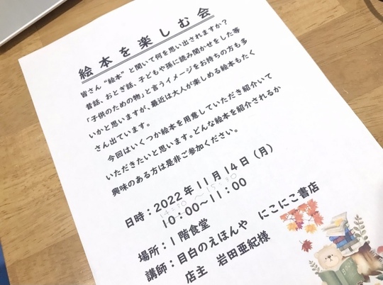 2022年秋より、近隣の介護付き有料老人ホーム サン・ラポール目白さまにて、ご利用者さまに向けた「絵本を楽しむ会」を開催中です。施設さまからのご依頼は、「絵がきれいなもの」「昔読んだ懐かしいお話」や「探したり、眺めるだけでも楽しめるもの」など。そこへ、季節を感じられる絵本や、実際に声を出して参加できる絵本なども織り交ぜながら、絵本のひとときをお楽しみいただいています。