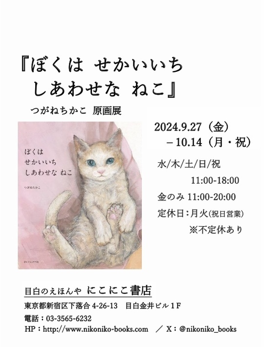 誰かに大切にしてもらう嬉しさと、誰かを大切にする喜びとーー。2024年9月の新刊絵本『ぼくは せかいいち しあわせな ねこ』つがねちかこさんの原画展を開催します。