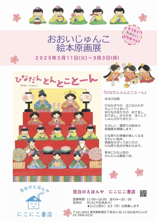 ひな祭りの時期にぜひお楽しみいただきたい『ひなだん とんとことーん』。昨年発売直後よりご家庭や保育の現場でも大人気の絵本の原画展を、今年まさにぴったりな季節に、にこにこ書店で開催していただくことになりました。