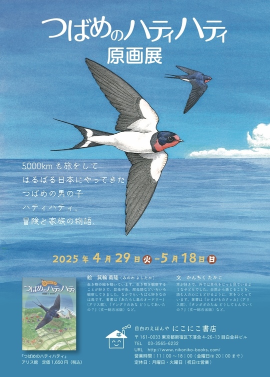 「鳥のおはなし絵本」シリーズ第一作目として誕生した『つばめのハティハティ』。毎年各地の本屋さんや展示の場で、そのかっこいい姿をお披露目し早くも12年。今年は、にこにこ書店に飛んできてくれることになりました。