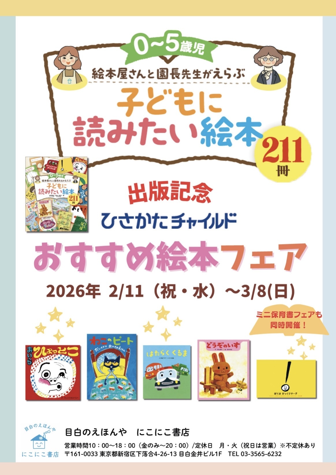 にこにこ書店店主の岩田が、保育士の頃にお世話になっていた鈴木八重子園長先生と共に書かせていただいた『0-5歳児 絵本屋さんと園長先生がえらぶ子どもに読みたい絵本211冊』。昨年11月の発売以来、さまざまな本屋さんや店内でも、お手に取っていただき感謝の気持ちでいっぱいです。その出版を記念して、この度「ひさかたチャイルド おすすめ絵本フェア」をにこにこ書店で開催することとなりました。