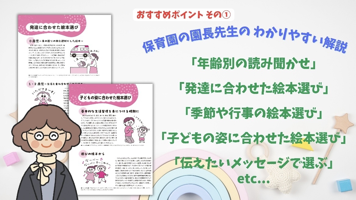 ●鈴木八重子園長先生の保育エピソードページや、保育のシーン別に岩田が選書したおすすめ絵本の展示・販売