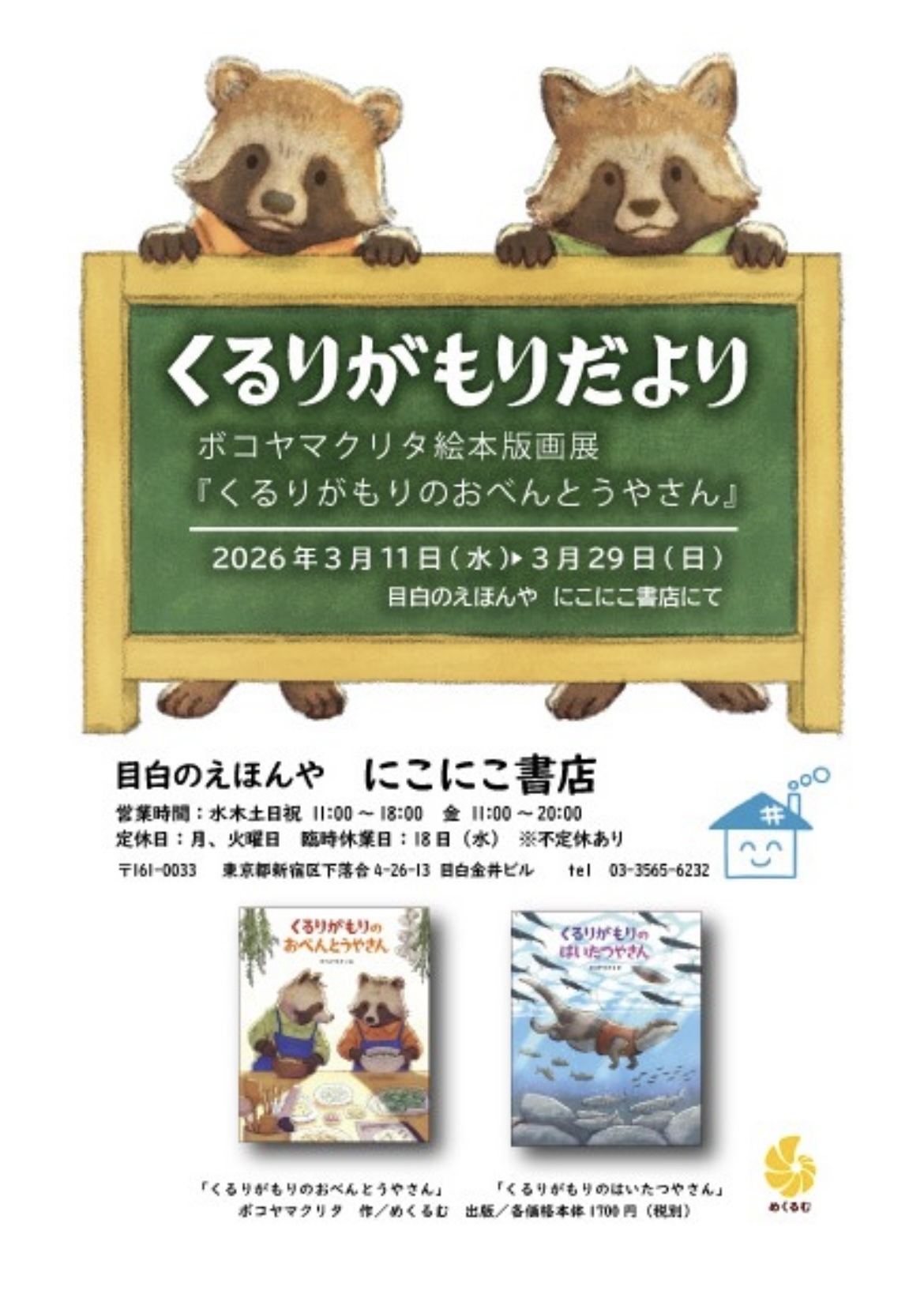 昨年5月発売、ボコヤマクリタさん作『くるりがもりのおべんとうやさん』絵本版画展のお知らせです!