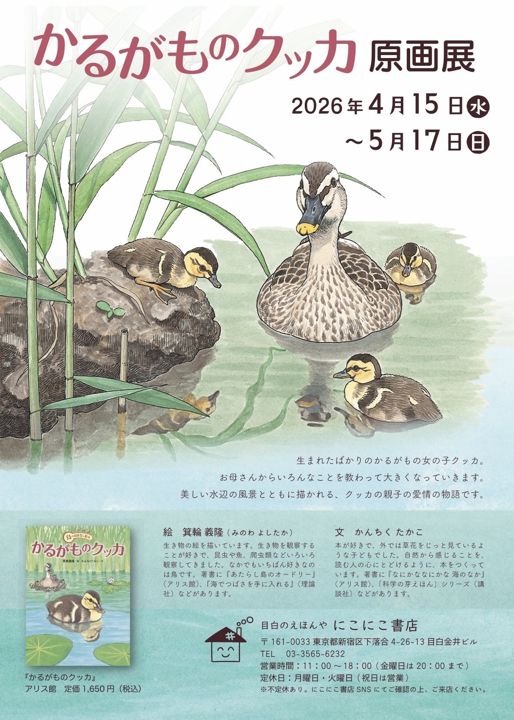 わたしたちの身近で生きる鳥たちを描いた、スタジオ・ポーキュパインさんの「鳥のおはなし絵本」シリーズ。今年は、生まれたばかりのかるがもの女の子「クッカ」の成長の物語『かるがものクッカ』原画展を開催していただきます。